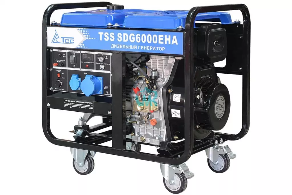 Дизель генератор с электростартом и с разъемом для подключения блока автоматики. TSS SDG 6000EHА предназначен для выработки электроэнергии с основными характеристиками: напряжение - 220 вольт, частота 50 Гц и номинальной мощностью 6 кВт, оснащенный колесным комплектом для удобства передвижения.